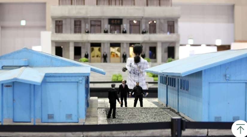 9·19 평양 공동 선언 1주년을 맞아 18일 경기도 고양 킨텍스에서 열린 ‘2019 DMZ 페스타’에서 한 관람객이 판문점을 배경으로 한 남북미 정상의 3자 회동 모형관을 구경하고 있다. 연합뉴스