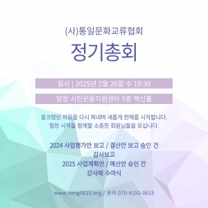 ** 2025 정기총회 공고 **25년을 맞이하여 한 해를 돌아보고 새롭게 사업을 펼치기 위한 정기총회를 개최합니다.올 한해 통일문화교류협회가 힘차게 진행할 사업들은무엇이 있을지 많은 기대와 관심 가져주시고적극적인 참여와 응원 속에 힘 있게 출발할 수 있도록자리를 빛내주시길 바 . . .